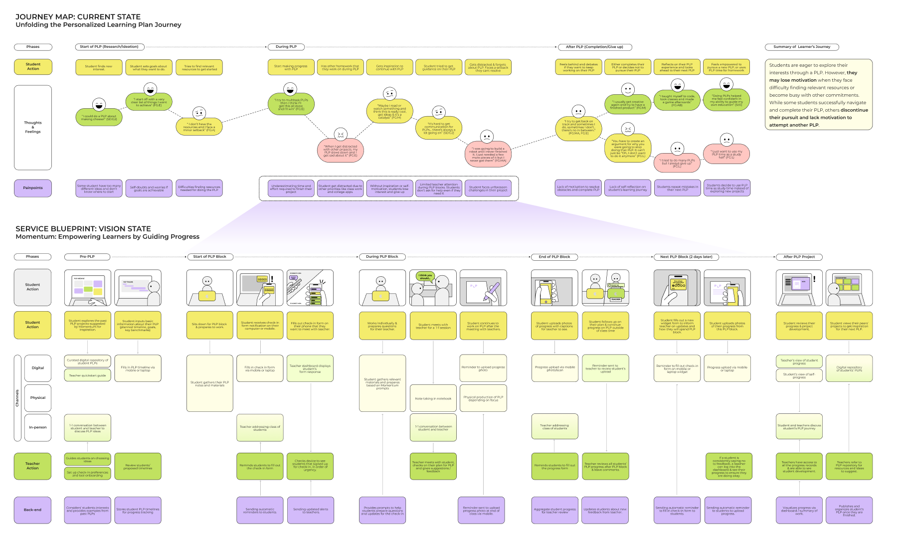 On the top level, we chose to represent the current state as a Journey Map to highlight the feelings of excitement and varying motivation levels students experience throughout their PLP.